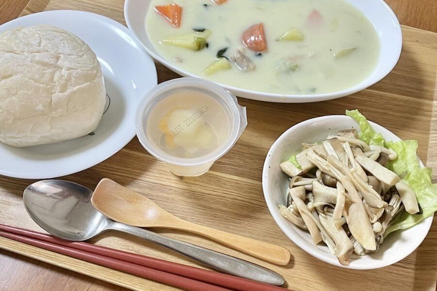 ロールパン、クリームシチュー、きのこマリネ、ゼリー